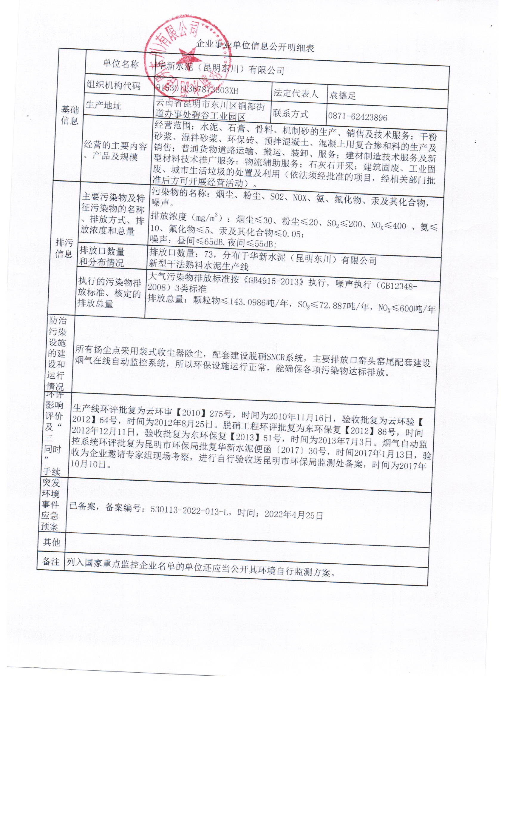 根據(jù)企業(yè)事業(yè)單位信息公開文件要求,華新水泥(昆明東川)有限公司對企業(yè)事業(yè)單位信息明細(xì)表(包含基礎(chǔ)信息、排污信息、防治污染設(shè)施建設(shè)和運(yùn)行情況、環(huán)評影響評價及“三同時”手續(xù)、突發(fā)環(huán)境事件應(yīng)急預(yù)案),2023年自行監(jiān)測方案,2023年第四季度窯頭在線監(jiān)測季度報表,2023年第四季度窯尾在線監(jiān)測季度報表,第四季度比對委托監(jiān)測,第四季度自行性委托監(jiān)測進(jìn)行公示。